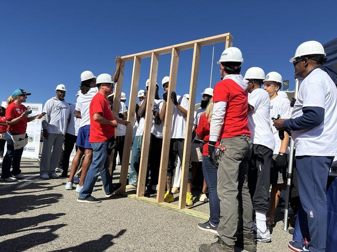 北京时间10月12日,快船全队在英格尔伍德参加社区活动,小卡、哈登、保罗等球员都戴着安全帽并且干起了木工活,期间哈登看着正经干活的小卡哈哈大笑,40岁保罗认真工作;另外快船众将与当地球迷互动,活动结束后全队合影留念。